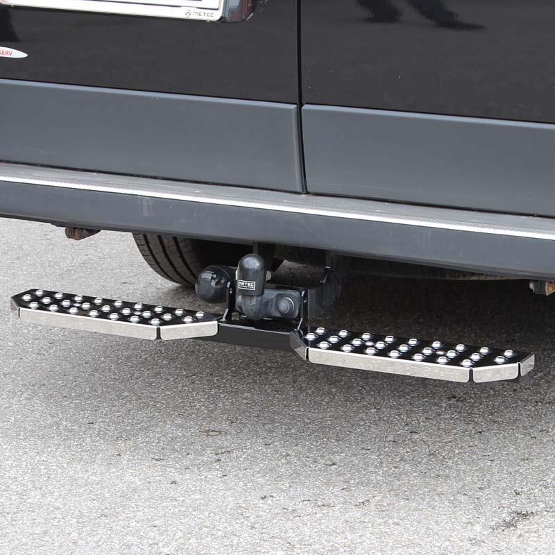 - Zur Montage an Universal-Anhängeböcken mit 2-/ 4- Loch Adapterplatte - Nicht verwendbar bei AHK mit angeschweißtem Kupplungshaken - Gesamtbreite: 1.120 mm - Trittflächenmaße: 2 x 460 mm x 150 mm - Montage erfolgt mit originalen Bolzen - Max. Traglast: 120 kg